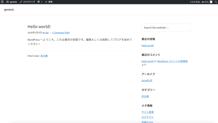 これで、Genesis sampleテーマが サイトのテーマとして反映されました。